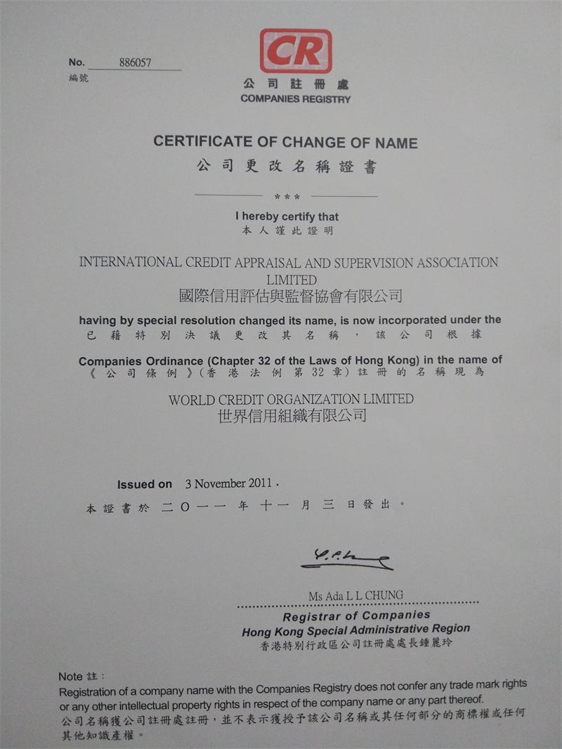 (later renamed World Credit Organization Co., Ltd., company certificate does not need to be renewed every year): ID: 886057